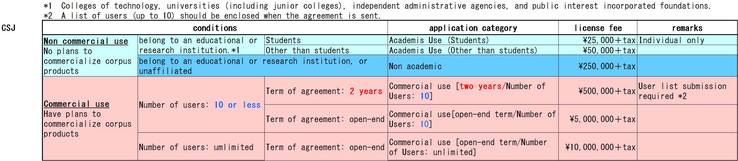Formats of "Corpus of Spontaneous Japanese" License Agreement: